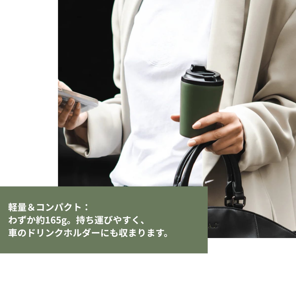 ・軽量&コンパクト:わずか約165g。持ち運びやすく、車のドリンクホルダーにも収まります。
