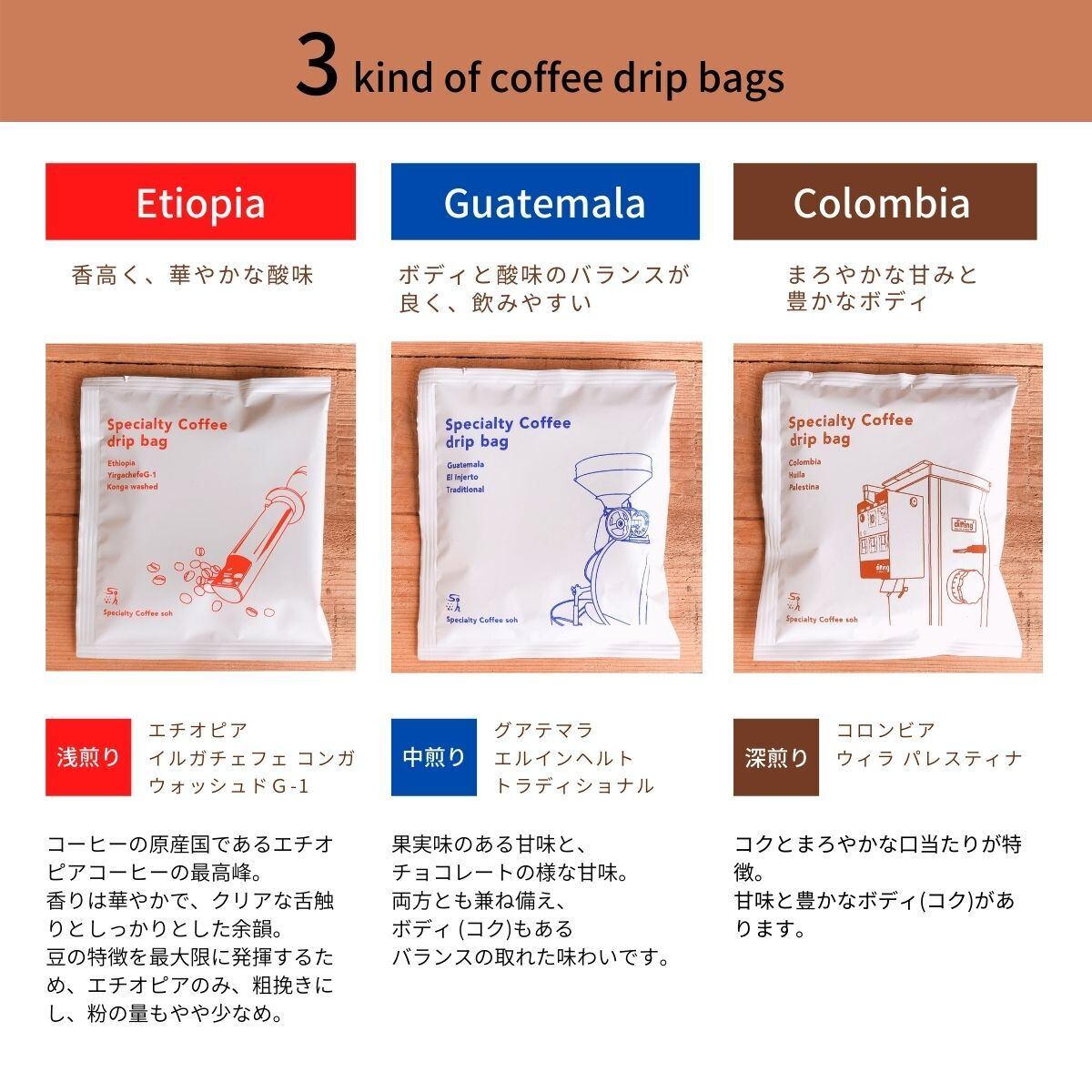 エチオピア・グアテマラ・コロンビア各1袋ずつ合計3袋入り
