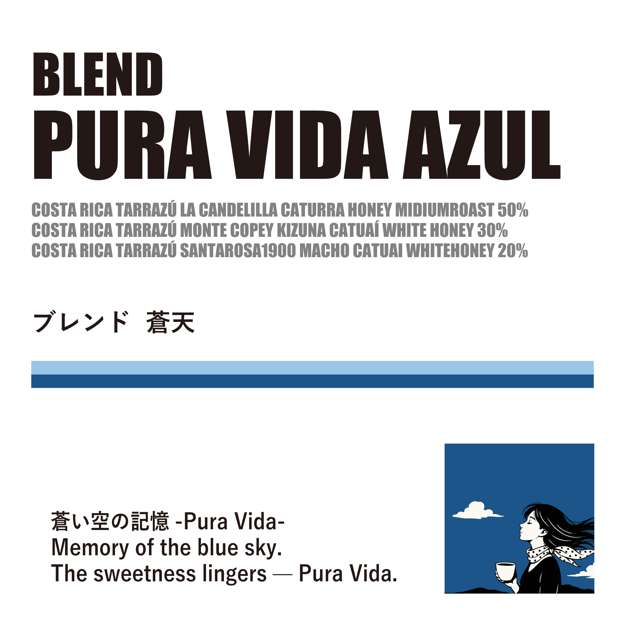 英名 PURA VIDA AZUL は、コスタリカで人々が日常的に交わす合言葉「Pura Vida(プラヴィーダ/元気、最高!)」に、スペイン語で青を意味する「Azul」を重ねました。旅先で見上げたあの抜けるような空の蒼さ、清らかさと、当店の名に掲げた「蒼」をひとつに結びつけたブレンド名です。